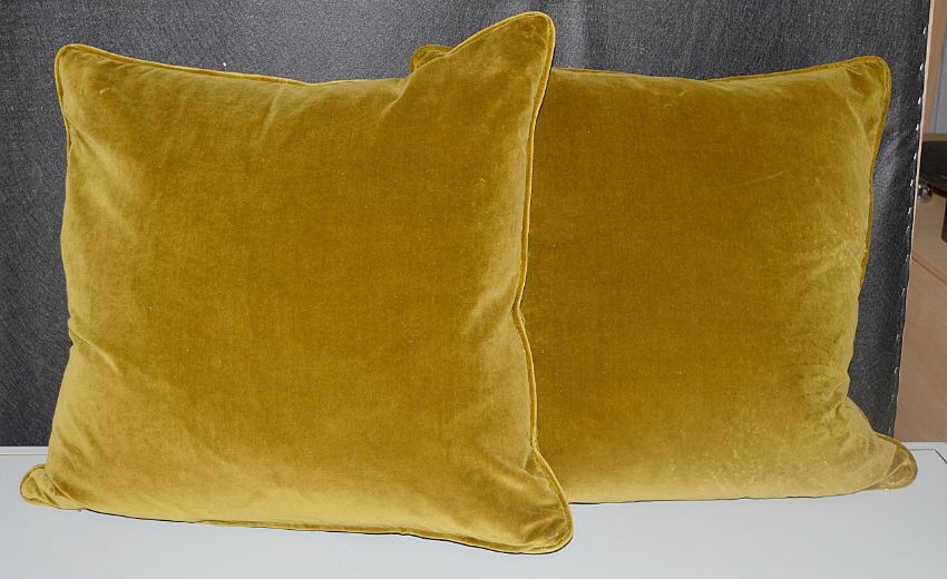 Pair of ANDREW MARTIN Luxury 100% Duck Feather Filled Scatter Cushions in a Mustard Gold Velvet Fabric - Made in the UK - Total Original RRP £300.00 - CL1079 - NO VAT ON THE HAMMER - Location: Altrincham WA14