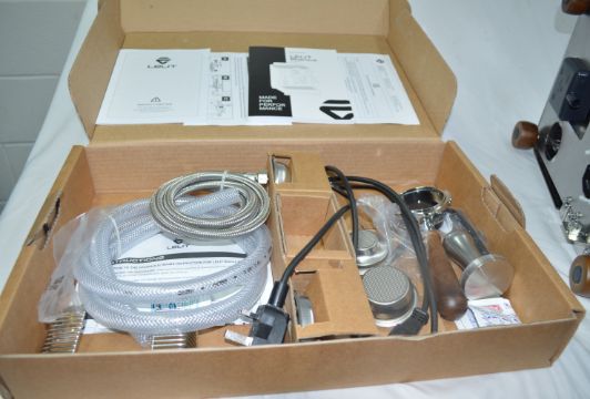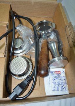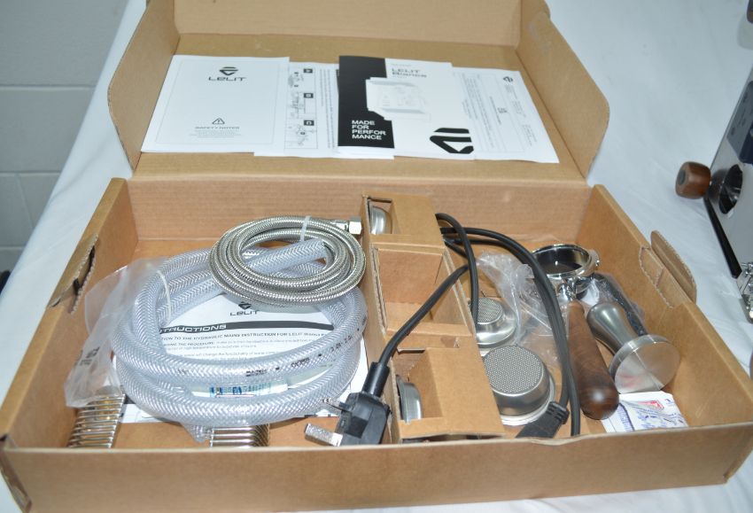 LELIT58 bottomless filter holder with wooden handle, handle and Coffee Slide spout, LELIT58 1 dose filter (9-11 g), LELIT58 2 doses filter (14-18 g), LELIT58 2 doses (18-21 g), LELIT58 blind filter, LELIT58 stainless steel tamper, Spoon for coffee powder, cup rack, water softener filter, brush microfiber cloth and cleaning kit