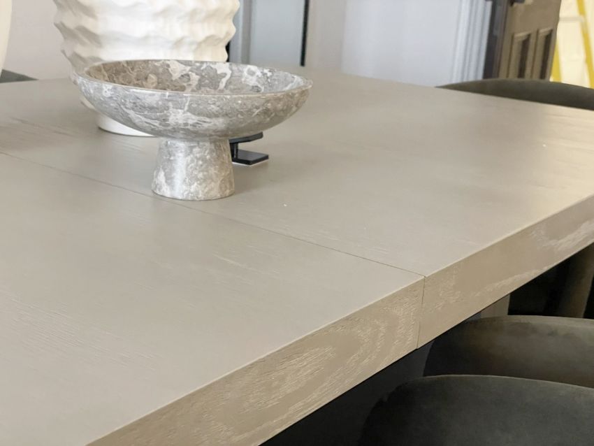 Item Description: Beautifully bridging form and function, this extendable dining table from Andrew Martin's 2024 collection by Kelly Hoppen, is crafted in a refined taupe finish to showcase the natural beauty of ash and oak veneers. Its architectural design is streamlined and sophisticated, with matte black accents for added depth and contrast. Perfect for gatherings of all sizes, it adds a note of warmth and organic elegance to any dining interior. This table extends to 280cm to seat upto 8 persons.