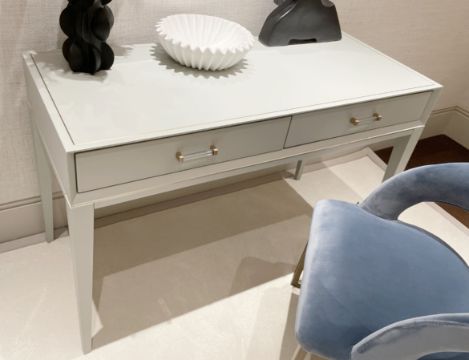 1 x RV ASTLEY 'Barra' Luxury 2-Drawer Dressing Table in a Warm Grey Tone, Brass Finishes and Clear Handles - Original RRP £800.00 - Ref: OWO056 / DRSSNG - CL1079 - NO VAT ON THE HAMMER - Location: Altrincham WA14