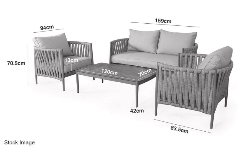 Item Description: Handcrafted from premium outdoor rope fabric, our Milan 2 Seat Set is designed to transform your outdoor space into a stylish haven that will undoubtedly turn heads. The Maze Milan 2 Seat Sofa Set showcases sweeping arched backs on both the sofa and armchairs, meticulously designed for ergonomic comfort and visual appeal. The substantial aluminium frame provides unwavering stability, while the thick rope weave adds a refined touch of elegance that sets this set apart.