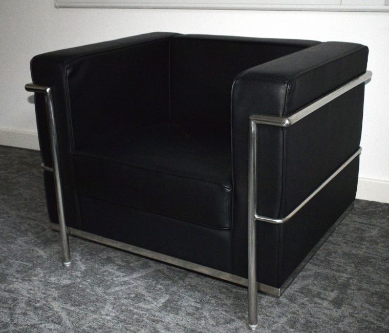 1 x Le Corbusier LC2 Replica Lounge Chair Featuring Black Leather Upholstery and Chrome Frame - Dimensions: H70 x W87 x D74 x SH42 x SW55 x SD53 cms - Ref: WH2 HC231 - CL1076 - Location: Altrincham WA14