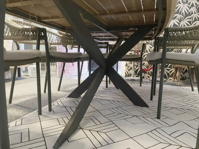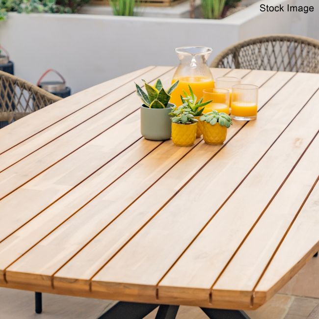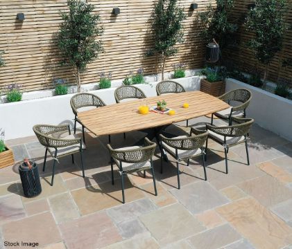 Item description: Perfect for family lunches and social gatherings, our fabulous dining set comes complete with 8 stackable chairs. Each chair is curved in shape with slender dark grey powder coated legs, with a woven olive green rope design and includes oatmeal fabric tie-back seat cushion. The fixed Oval sustainably sourced acacia wood top dining table mimics the deck of a yacht, this Bali dining table set creates an ambience of authentic charm, while its crossover metal frame base gives it a contemporary look.