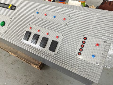 1 x Large Scale Plastic Brick Sculpture of Two Interactive Control Panel - Features Electronic Illuminated Buttons and Comes in Three Sections with a Total Combined Length of 15ft - Constructed with Genuine Lego Bricks - Created with Approx 140,000 Bricks - Dimensions: H62 x W115/115/238 x D63 cm - Ref: LG115 - CL1077 - Location: Cheshire