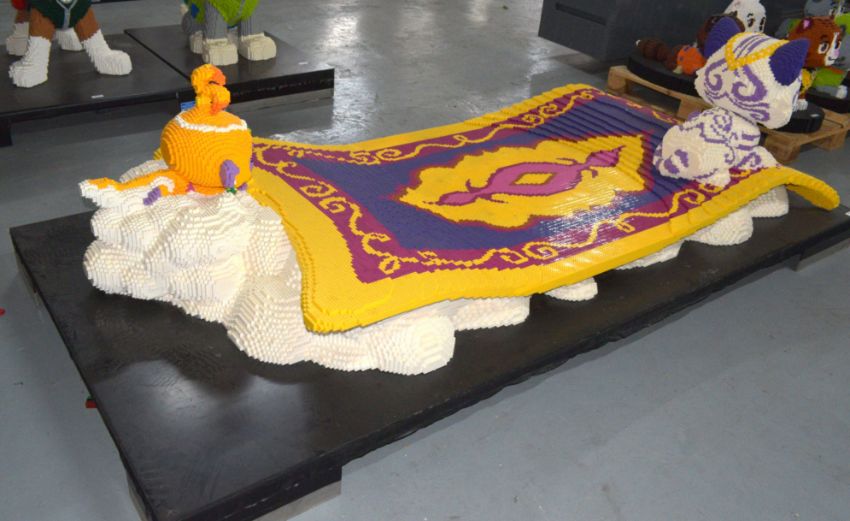 1 x Large Scale Plastic Brick Sculpture of Two Cartoon Style Characters Flying an Iconic Magic Carpet on Clouds - Constructed with Genuine Lego Bricks and Fixed on a Raised Stainless Steel Platform - Approx Size: 73 x 260 x 120 cm - Ref: LG104 - CL1077 - Location: Cheshire