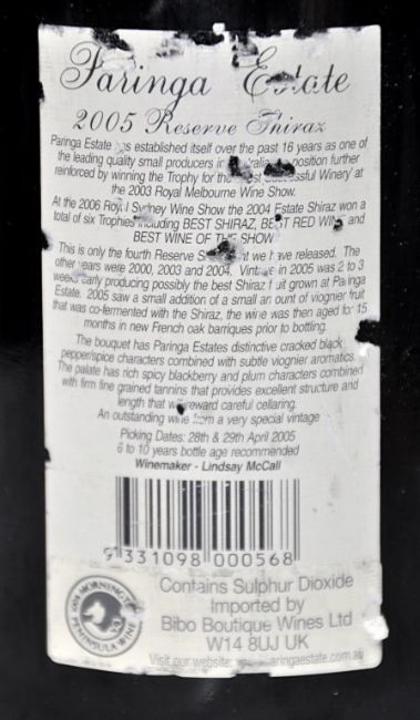 1 x Paringa Estate Single Vineyard Special Barrel Selection Reserve Shiraz, Mornington Peninsula, Australia - 2005 -Bottle Sizes 75cl - Volume 14.5% - Ref W649 - CL101 - Location: Altrincham WA14