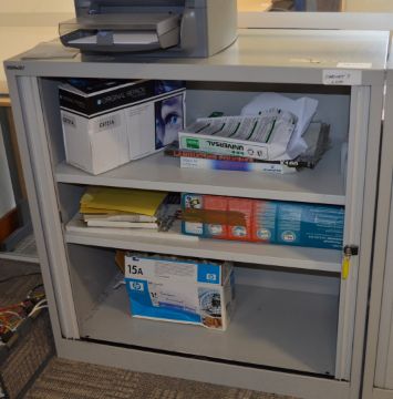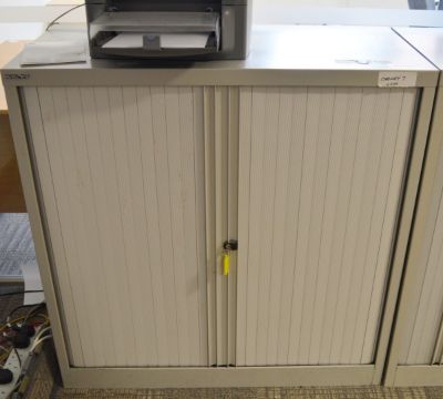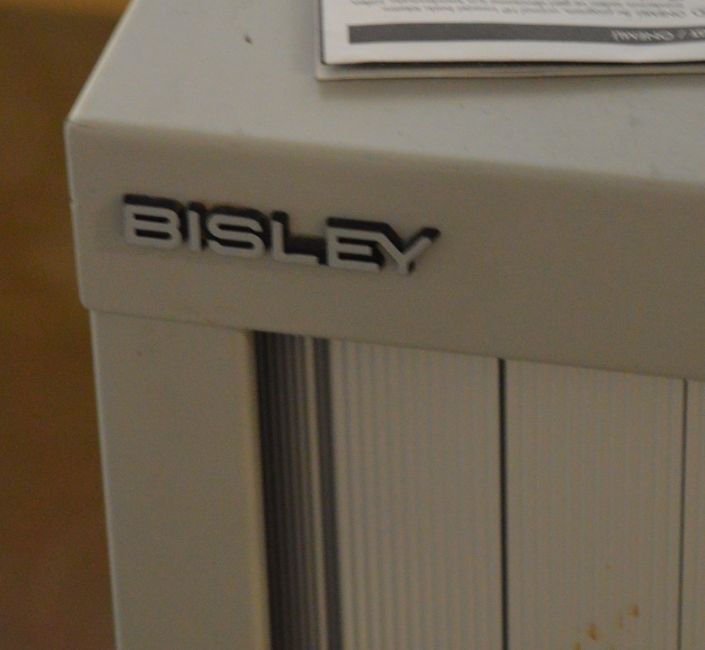 1 x Bisley Office Storage Cabinet With Tambour Sliding Doors - Includes Key - H101 x W100 x D47 cm - High Quality Grey Steel Cabinet - Perfect For Storing Office Documents and Stationary - Ref SB026 - CL106 - Location: Manchester M1 - RRP £450! - Please N