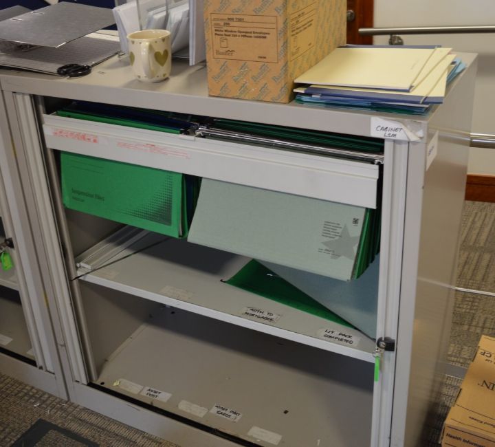 1 x Bisley Office Storage Cabinet With Tambour Sliding Doors and Roll Out File Frame - Includes Key - H101 x W100 x D47 cm - High Quality Grey Steel Cabinet - Perfect For Storing Office Documents and Stationary - Ref SB034 - CL106 - Location: Manchester M1 - RRP £550! - Contents Not Included!