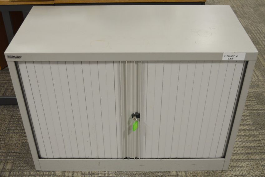 1 x Bisley Office Storage Cabinet With Tambour Sliding Doors - Includes Key - H71 x W100 x D47 cm - High Quality Grey Steel Cabinet - Perfect For Storing Office Documents and Stationary - Ref SB095 - CL106 - Location: Manchester M1 - Contents Not Included!