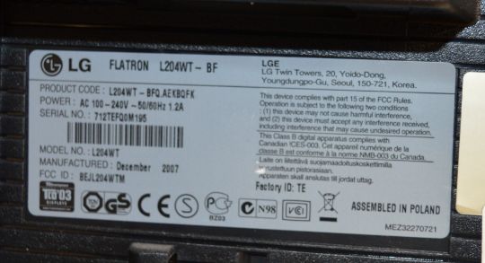 1 x LG Flatron L204WT Widescreen LCD Monitor - 20 Inch Screen Size - 1680 x 1050 Native Resolution - 5 ms Response Time - From Working Office Environment - Cables Not Included - Requires Standard Kettle Power Lead - Ref SB049 - CL106 - Location: Manchester M1