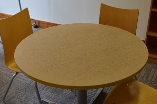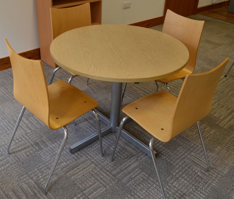1 x Staff Room Table With Four Matching Chairs - Oak Table Finish and Beech Chairs - Contemporay Design - Ref SB004 - Height 72cm x Diameter 90 cms - Ideal For Canteen, Kitchen or Staff Room - CL106 - Location: Manchester M1