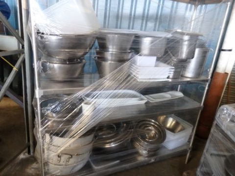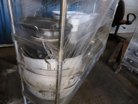 1 x Cidelcem Stainless Steel Catering Four Tier shelving Unit With Contents - Size: 142cm x 36cm x height 160cm - Ref 86A - Contents Include Various Pots, Strainers and Ceramics etc - Please See The Pictures Provided - CL057 - Location: Welwyn Garden City, Hertfordshire, AL7