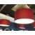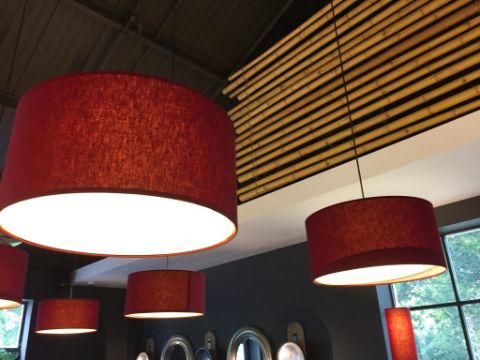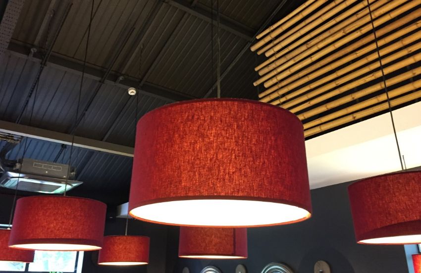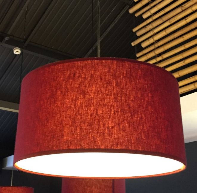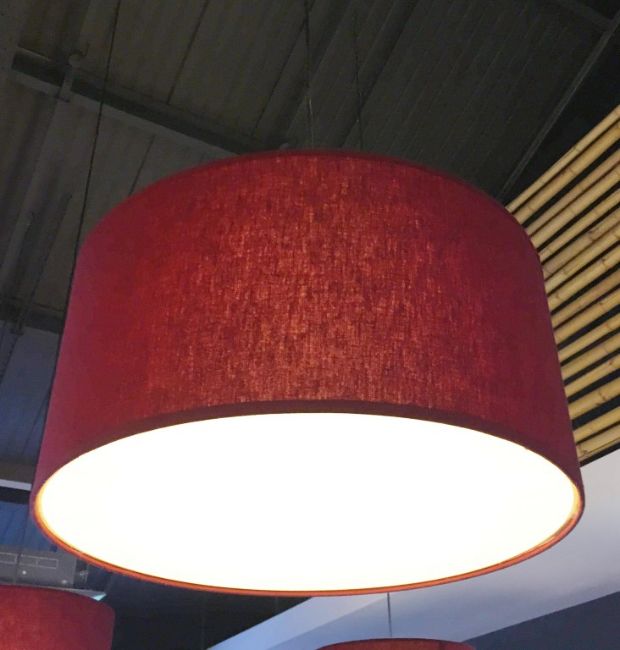 10 x Contemporary Suspended Drum Ceiling Light Pendants in Red Fabric - Pendant Size: 51 cm Diameter x 25 cm Height - Buyer to Safely Remove - Ideal For Restaurants, Clubs, Hotels or Other Business Premises - Ref 4 - CL200 - Location: Somerset BA16