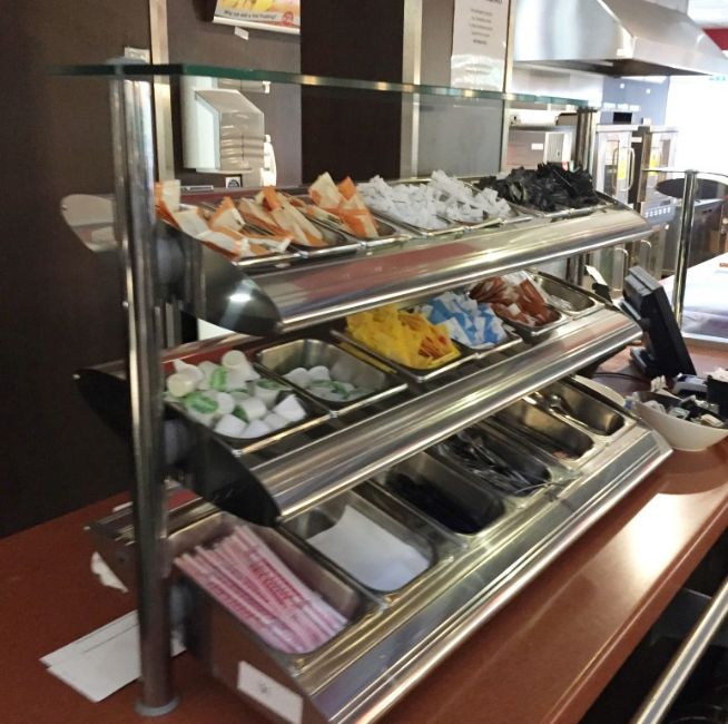 1 x Chrome Table Top Cutlery and Condoment Organiser Dispenser With Stainless Steel Trays and Contents - Buyer to Carefully Remove - Dimensions H70 x W104 x D43 cm - Ref 181 - CL200 - Location: Somerset BA16
