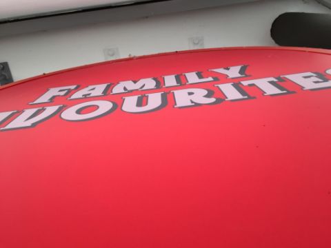 1 x Ceiling Mounted FAMILY FAVOURITES Illuminated Advertisement Sign - Round Design - Dimater 65cm - Buyer to Carefully Remove - Height Suspended From Ceiling 100cm - CL200 - Ref 112 - Location: Somerset BA16