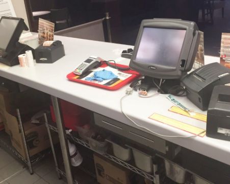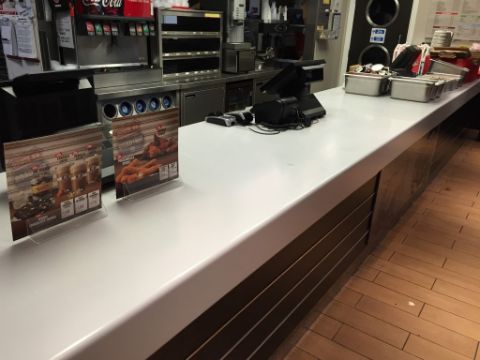 1 x Large Retail Counter Suitable For Fast Food Business or Retail Shop - Excellent Condition - Approx 22ft in Length - Large Hygienic Work Surface With POS cable Tidy Holes, Wenge Front With Chrome Details and Kickboard - Contemporary Design - CL200 - Location: Somerset BA16 - H95 x W675 x D90 cm - Please Note That The Burger King Sign, Epos Systems and Other Accessories Pictures ARE NOT Included in this lot, you are bidding on the counter only.