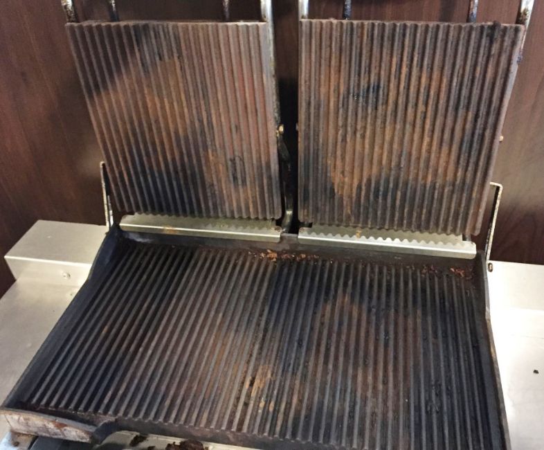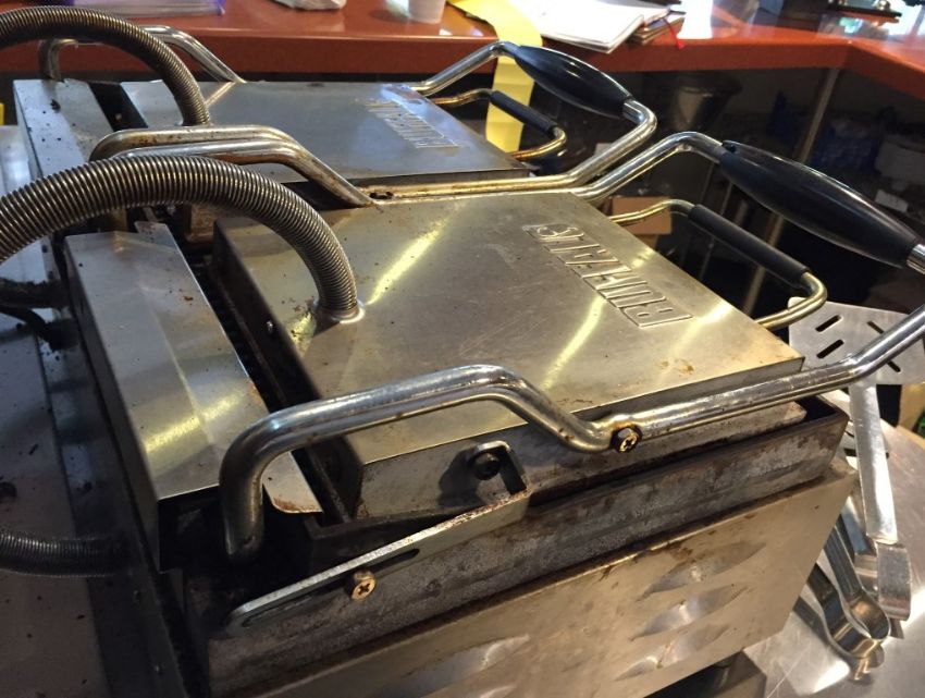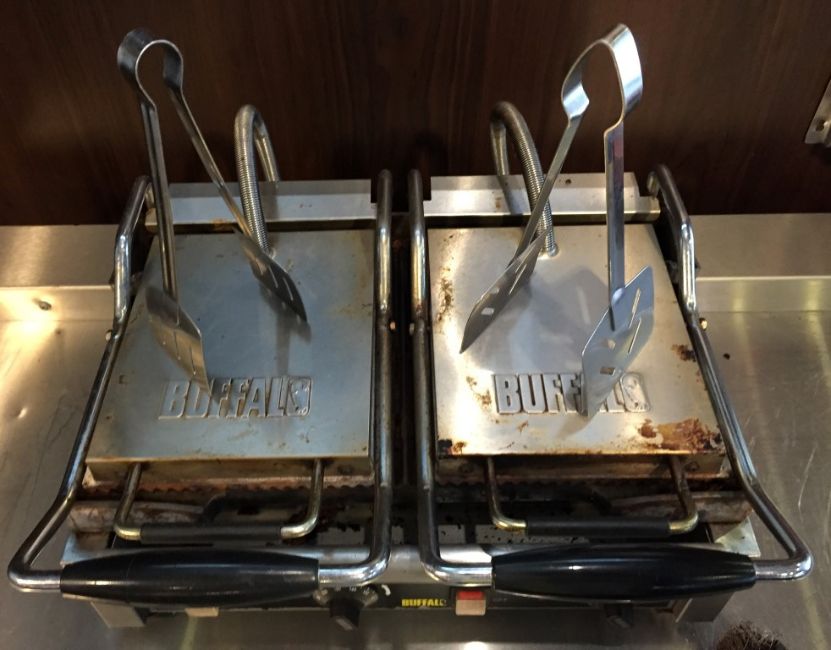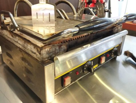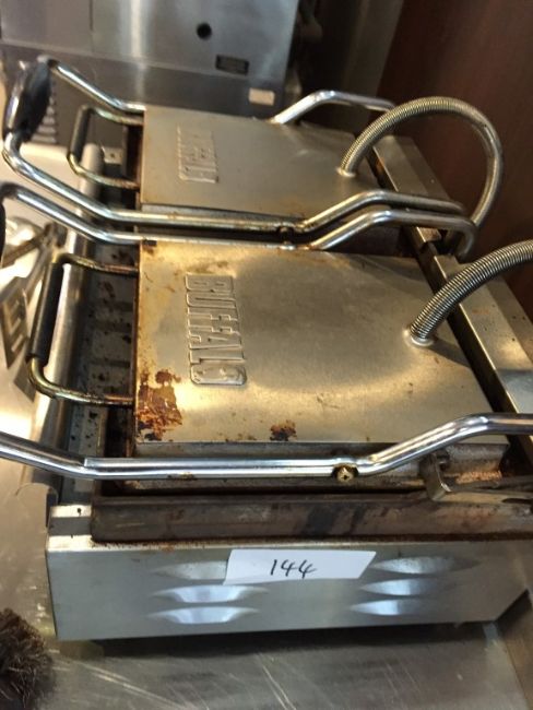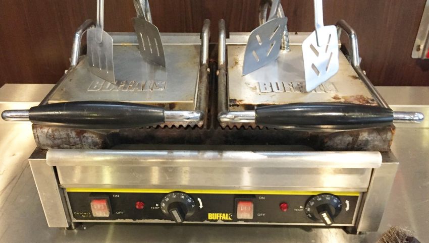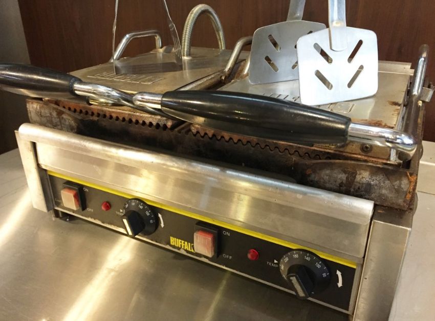 1 x Buffalo Contact Grill - Features Ribbed and Flat Grills - Ideal For Making a Variety of Foods Including Paninis - Includes Grill Scrubber and Cooking Tongues - 240v Plug - CL200 - Ref 144 - Location: Somerset BA16