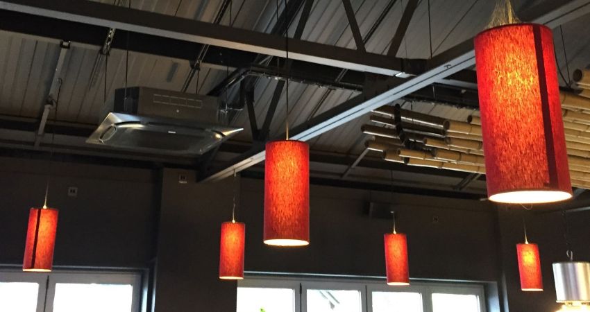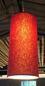 10 x Contemporary Suspended Tube Ceiling Light Pendants in Red Fabric - Pendant Size: 20 cm Diameter x 46 cm Height - Buyer to Safely Remove - Ideal For Restaurants, Clubs, Hotels or Other Business Premises - Ref 3 - CL200 - Location: Somerset BA16