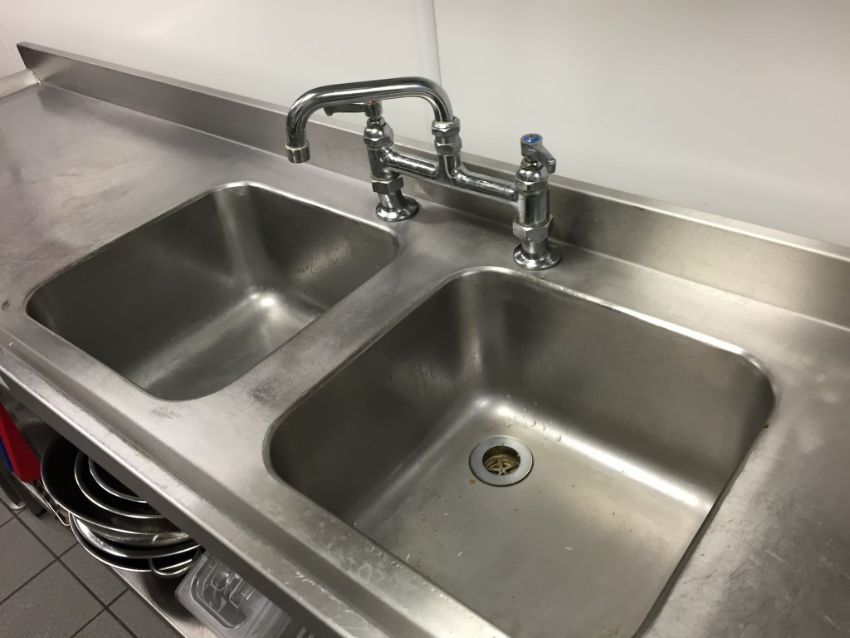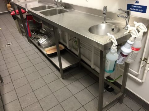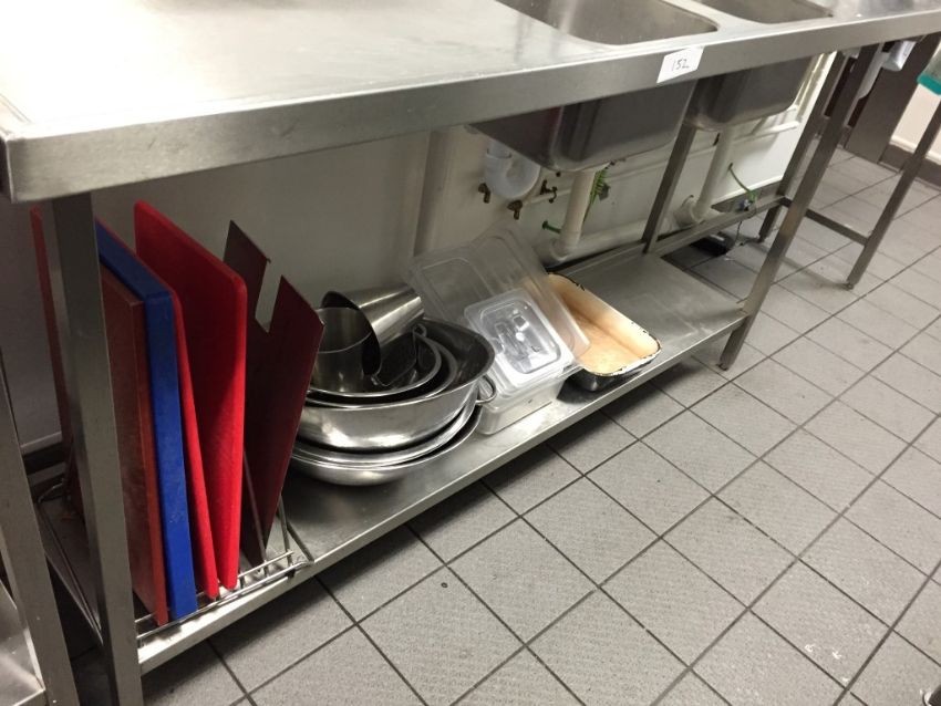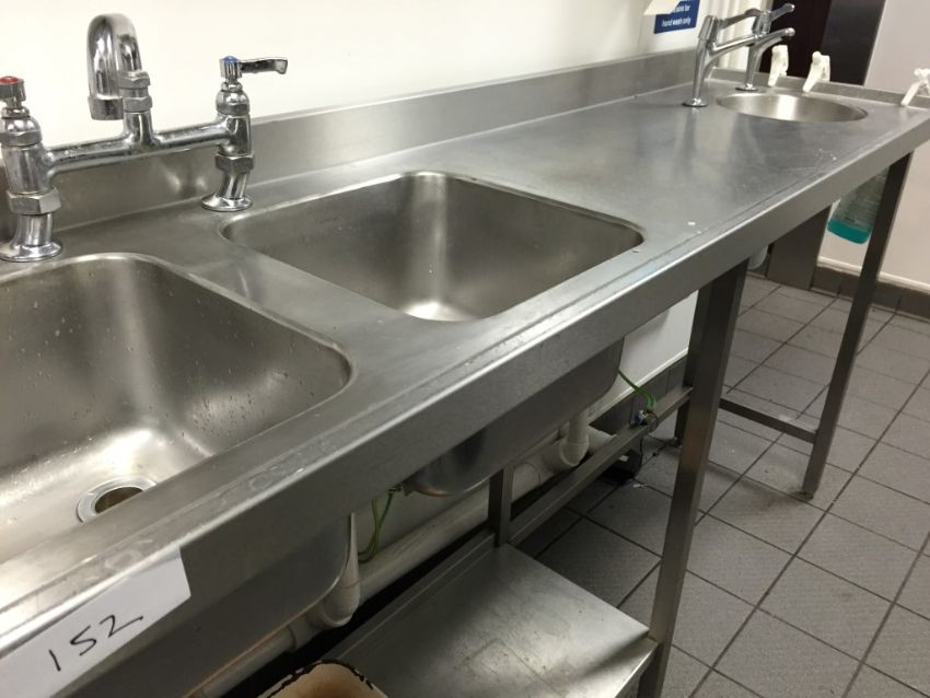 1 x Large Twin Bowl Stainless Steel Sink Unit and Contents - H92 x W249 x D50 cm - Ref 152 - Buyer to Safely Remove - CL200 - Location: Somerset BA16
