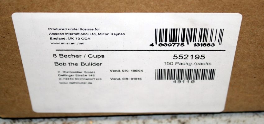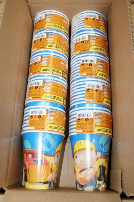 **Job Lot** 300 x Packs Of Amscan "Bob the Builder" Paper Party Cups - Each Pack Contains 8 x 250ml Cups - Popular Licenced Product By Amscan International - Disposable Party Tableware - Brand New Boxed Stock - CL114 - Code: 552195 - Location: Altrincham WA14 - Total RRP £448.50 **Low Start - No Reserve**