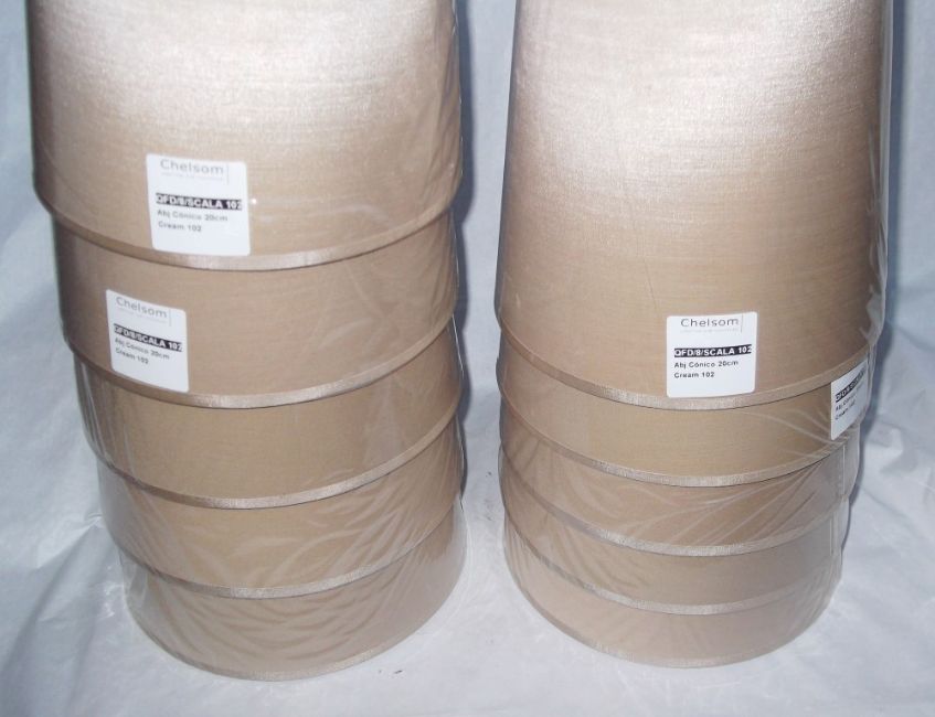 50 x DESIGNER TAPERED CYLINDER LIGHT SHADES By Chelsom - CL043 – Each Features A Silky Fabric In A Light Copper Tone – QFD/8/Scala 102 – Height:20cm - Top Diameter:20cm - Bottom Diameter:16cm - Max 40w - New Sealed Stock - Location: Altrincham WA14 - Approx RRP £1,500!