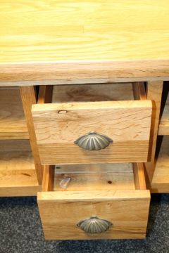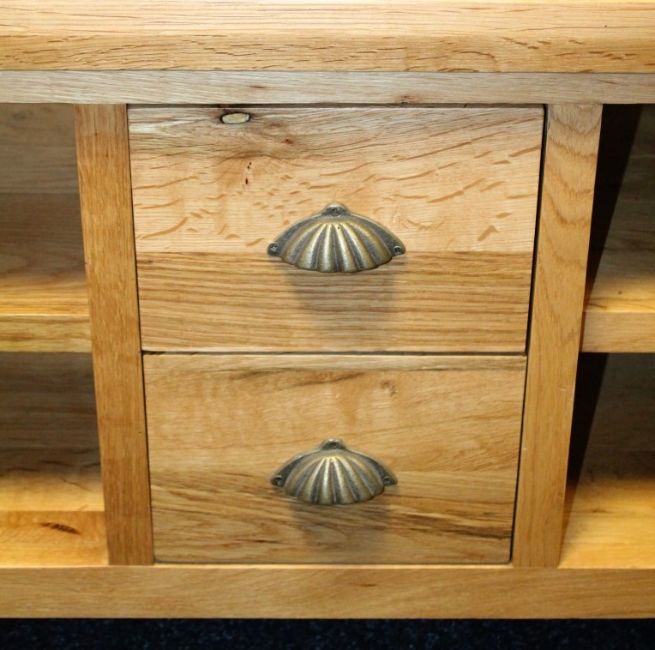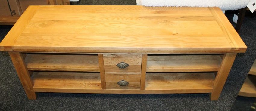 1 x Mark Webster 'Vermont' Solid Oak TV Unit (Widescreen) - 2-Drawers - Ex Display Stock – Dimensions: W150 x D50 x H56cm - Ref: F236 - CL156 – Location: Failsworth M35 – Original RRP £599.00