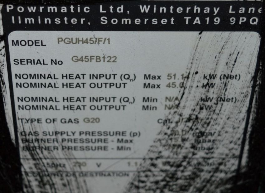 4 x Powrmatic Gas Heater Blowers - Industrial Sizes Heaters - Ideal For Warehouses, Workshops, Sports Halls or Other Large Open Areas - Model PGUH45/F/1 - Suitable For G20 Gas - CL090 - Ref RE - Location: Blackpool FY1 - Original List Price Approx £10,000!!! - Please note that it is believed that two of these units are in good working order but two are currently in a none working condition, so could be used for spares.