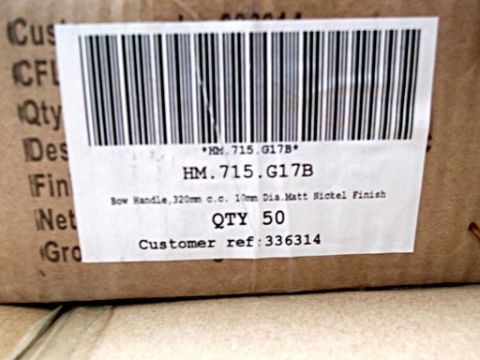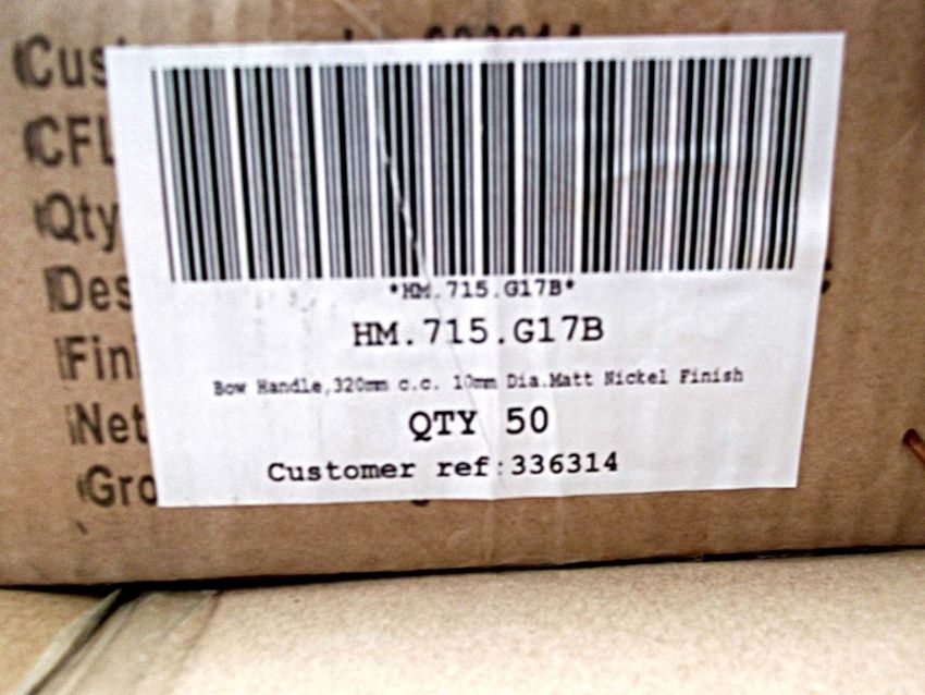 400 x BOW Handle Kitchen Door Handles By Crestwood - 320mm - New Stock - Brushed Nickel Finish - Fixings Included - Supplied as 8 x boxes of 50 handles - Ref HM.715.G17B - Chic Design - CL003 - Location Altrincham - Approx RRP £3200 We have here for auction, four-hundred (400) x attractive cabinet and drawer handles. These stunning BOW handles feature a beautifully fluid curve in a matt nickel finish. Ideal for any modern interior! - Bow - Matt Nickel finish - 320mmc - With fixings - HM.715.G17B These handles could be used on kitchen cabinets, draws, in the home office or on bedroom furniture. Each handle is individually packaged ready for resale. Supplied as 8 x boxes of 50 handles. **Approx RRP £3200**