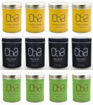 360 x Tins of CHA Organic Tea - PURE BLACK, GOLDEN MANGE AND PURE GREEN - 100% Natural and Organic - Includes 360 Tins of 25 Round Tea Bags 30 Boxes - Great Taste Gold Award 2012 - Handpicked from the Slopes of the Himalayas and Nilgiris - Best Before Date 2014 - Sealed Stock - Location: Altrincham WA14