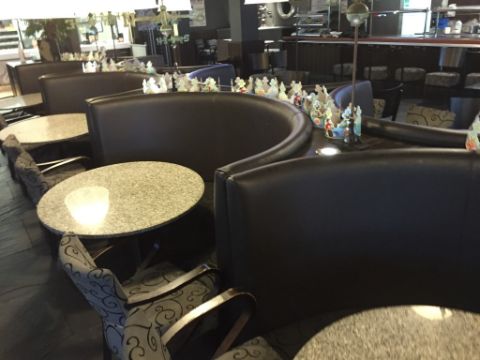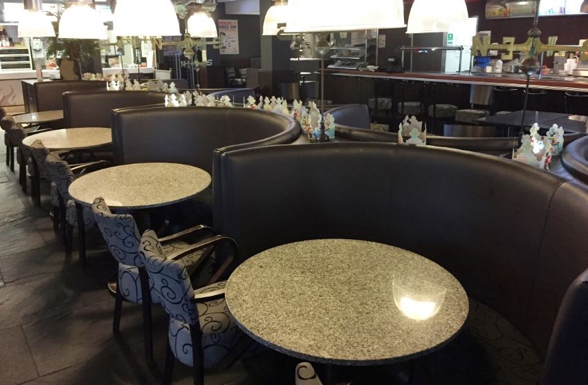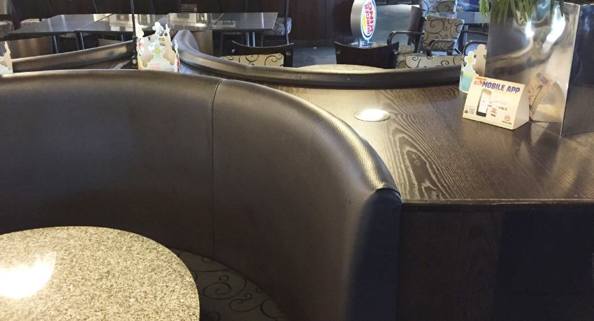 Huge Section of Banquet Seating Featuring 9 High Back Brown Faux Leather Seating Booths With Fabric Patterned Seats - Built into Dark Wood Frame With Halogen Uplight Fittings and Two Built In Litter Bins on Either End - Built With Four on One Side and Five on Other Side - Total Area of 9 Booths is 9.5m Length x 2.5m Depth - Dismantled and Removed From Site - Ready to Take Away - CL200 - Location: Somerset TA4 - Please note that the individual chairs and tables and NOT included.