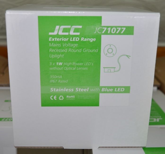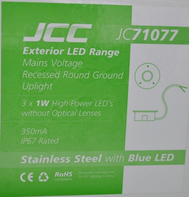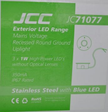 | 12 x JCC Lighting Exterior LED Mains Voltage Recessed GROUND UPLIGHT Sets - Twelve Sets of Three - Ideal For Patios or Decking - STAINLESS STEEL Finish With 3 x 1w Blue LED's - 350mA IP67 Rated - Brand New BOXED STOCK - Product Code JC71077 - Reference BL074 US - CL090 - Location: Blackpool FY1 - RRP £1,404! - See Link For Price Comparison - Full Box of 12 Sets - 130mm Width. |