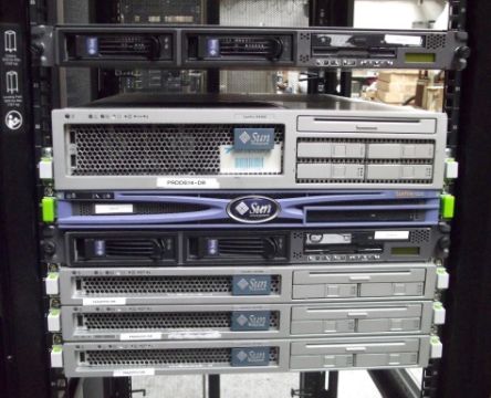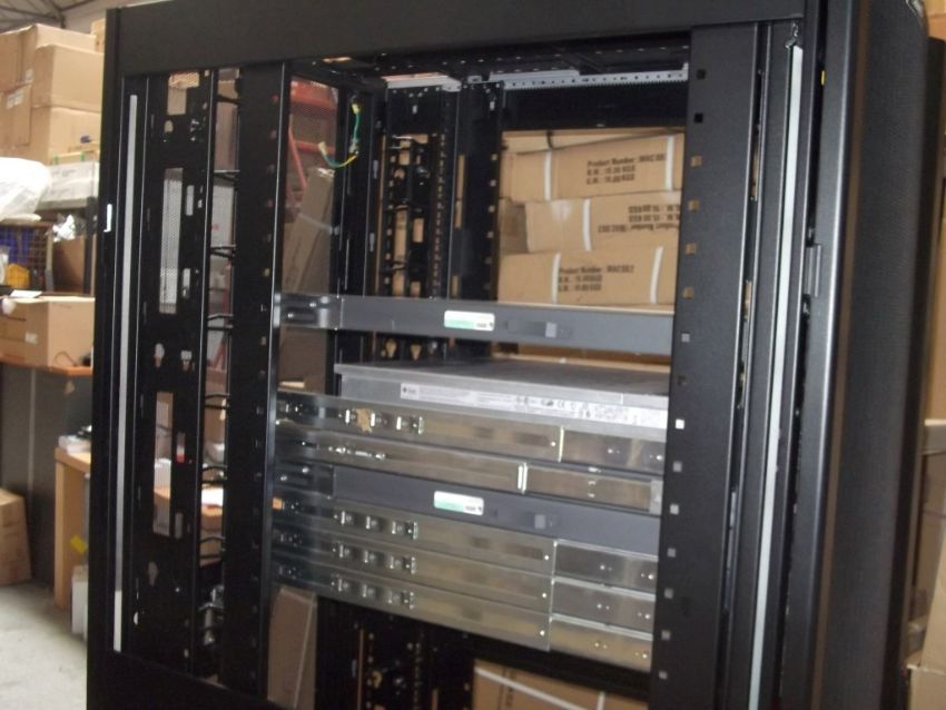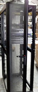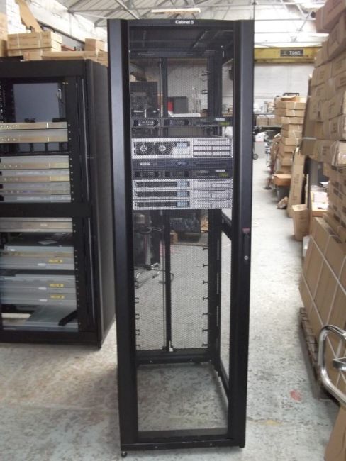 1 x APC Netshelter Server Rack With 7 x Assorted Sun Fire Servers (V & X-Series) - CL106 - Ref: NSB005 - Location: Altrincham WA14 - Black - 600 x 1070mm, Perforated Doors With Curved Profile For Ventilation - Please note that keys are not included. All hard drives have been removed. This item was carefully removed from a professional working environment. It comes without side panels, in excellent cosmetic condition as seen in the pictures provided.  Rack Includes: 2 x Sun Fire V202 1 x Sun Fire X4200 1 x Sun Fire V210 3 x Sun Fire x4100