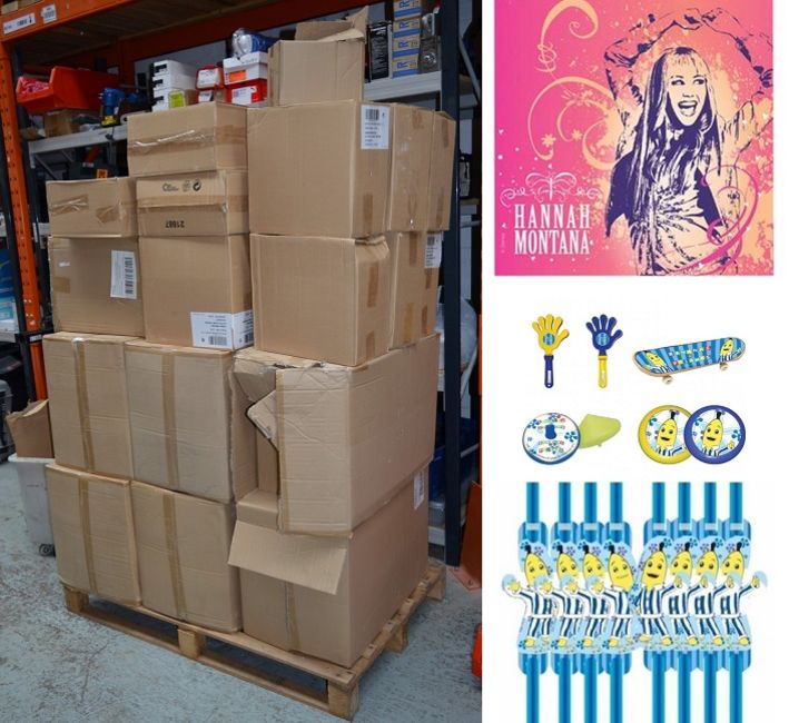 Pallet Job Lot - Includes 450 x Packs of Hannah Montona Party Napkins,  576 x Packs of Bananas in Pyjamas Party Favors and 240 x Packs of Banana in Pyjamas Flexible Drinking Straws - Brand New Stock - Approx RRP £5,500 - CL114 - Location: Altrincham WA14 Lots Includes: 15 x Boxes of Hannah Montana Napkins (450 packs of 20 Napkins) 1 x Boxes of Bananas in Pyjamas Straws (240 Packs of 8 Straws) 6 x Boxes of Bananas in Pyjamas Party Fabours (576 Packs x 24 Favors)