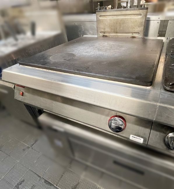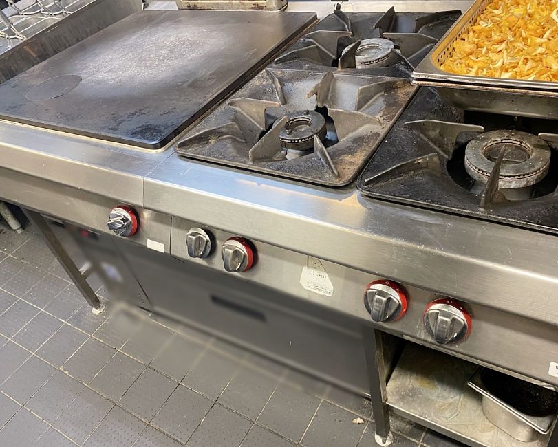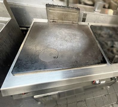 The lot consists of a large Gas-powered Griddle to the left-hand side, and a 4-Burner Hob With Small Under-Shelf to the right.