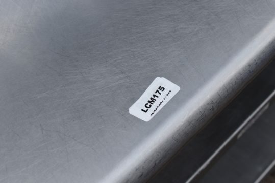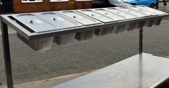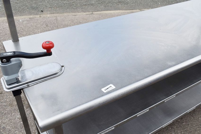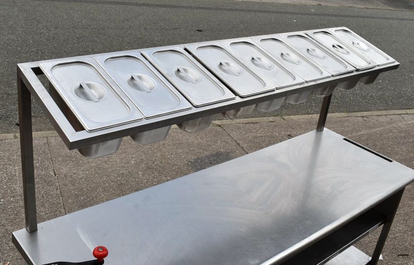 1 x Stainless Steel Mobile Prep Bench Featuring Overhead Pizza Topper Shelf With 9 Gastro Topper Pans and Lids - Prep Table With Undershelves and Bonzer Commercial Can Opener - Recently Removed From Major Supermarket Store - CL669 - Ref: LCM175 - Location: Altrincham WA14