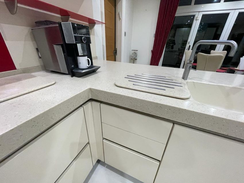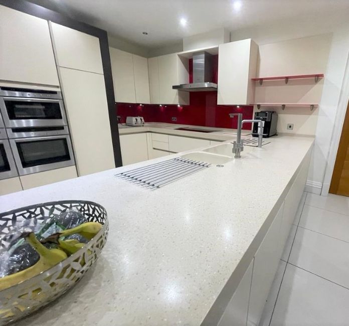Removal notes regarding the stone worktops and splashbacks: Whilst every attempt will be made to successfully remove worktops and spashbacks without damage, this is not always possible. Therefore, pieces with ‘cut outs’ eg Sinks, Hobs etc cannot be guaranteed. There will be a sheet of matching Corian included to help with any future repairs the worktops may need before or after your installation.