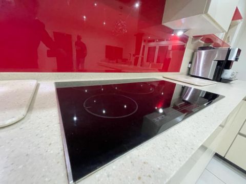 This contemporary SieMatic kitchen comes in a two-tone design with wenge wood detail and gloss slab doors & drawer fronts. The kitchen features stunning Corian worksurfaces with an integrated twin bowl sink basin and drainer plus a waste disposal unit and Quooker Hot Tap! Other features include soft close doors, undercabinet lighting, concealed storage drawers and waste bin on runners within cupboards, red wall shelves and red splashbacks (splashbacks are subject to safe removal).