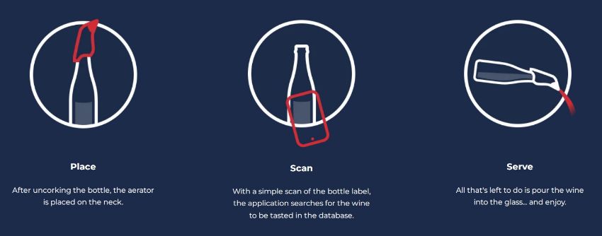• SIMPLE TO USE: Place the aerator on the opened wine bottle, scan the label with your phone, the application determines the correct oxygenation. All that remains is to serve the wine and enjoy its aromas.