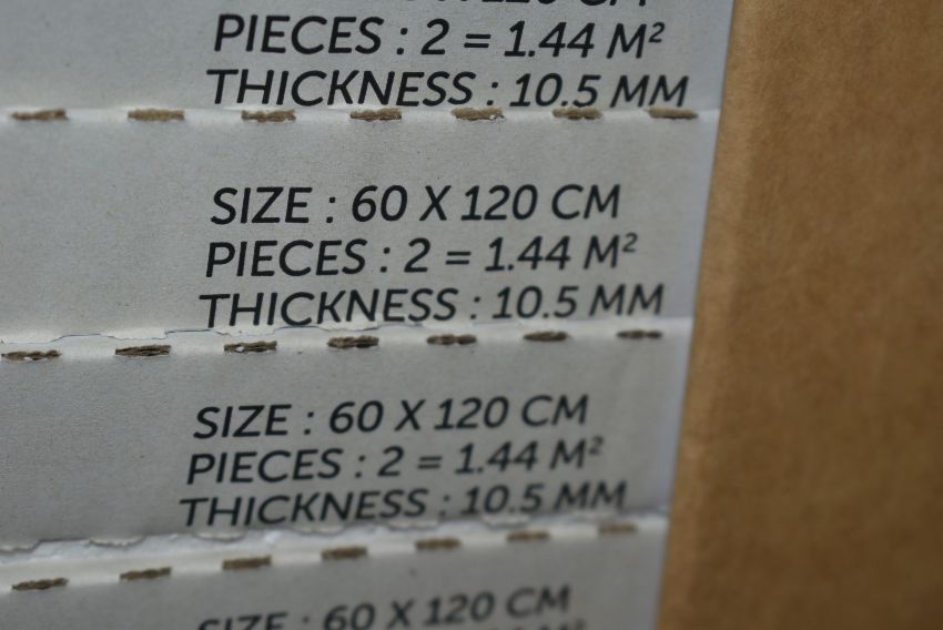 Supplied in 12 boxes, each box has 2 tiles and each tile measures 120 x 60 x 1 cms.