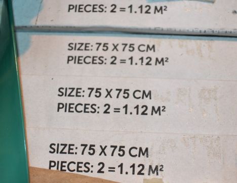 Supplied in 8 boxes, each box has 2 tiles and each tile measures 75 x 75 x 0.9 cms.