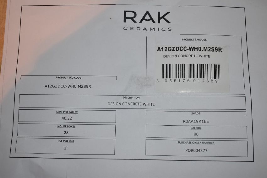 8 x Boxes of RAK Porcelain Floor or Wall Tiles - Design Concrete Range - White Colour With Matt Finish - Tile Size: 120 x 60 x 1cms - 2 Tiles Per Box / 16 Tiles in Total - Brand New Stock - CL486 - Ref: A12GZDCC-WH0 - P3 - Location: Altrincham WA14