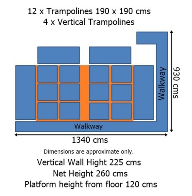 Please see the pictures provided to view a layout of this lot with approximate dimensions. This area covers an approx floor space of 1340 x 930 cms and has an overall height of 345 cms (without the safety net)