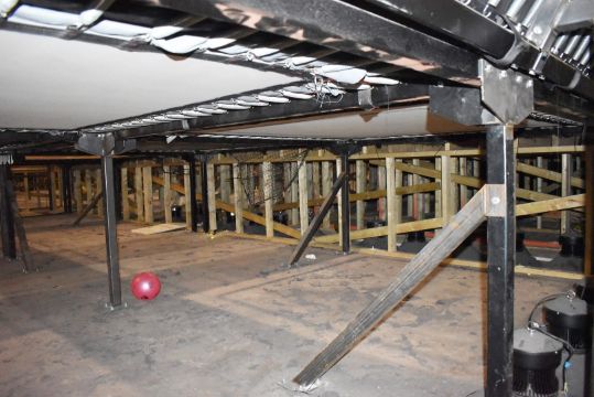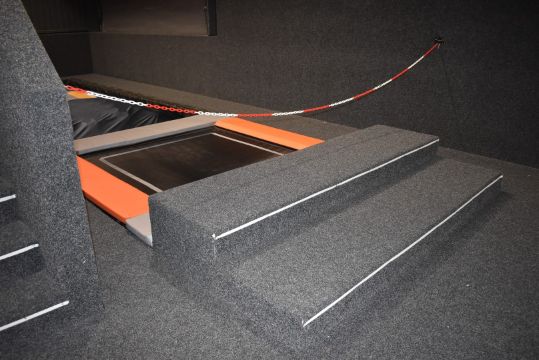 This is a gravity-defying trampoline playground with a total of 43 interconnecting trampolines including basketball trampolines with giant net and basketball hoops, rollover platform, a walk the wall trampoline with climbing wall, vertical stunt trampolines, multiple user trampolines and a battle beam fighting game with soft foam landing. This is built upon a raised floor which is supported by an interlocking bolted steel support system and timber frames supporting walkways. The platform also features a steel safety rail for the main walkway and two sets of steel access steps.