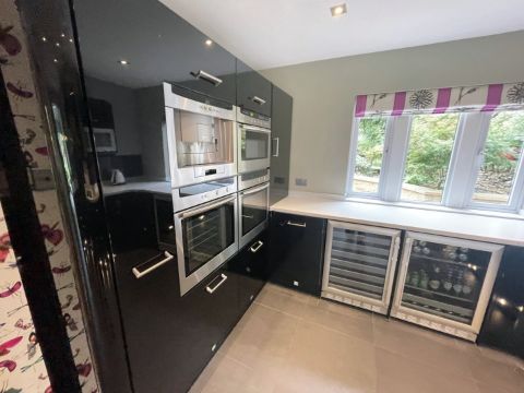 A beautiful kitchen complimented by 10 x premium appliances, 3cm thick Corian work surfaces, under-lighting and a plethora of storage from glass fronted overhead units to a tall pull-out Lader. The 3 x Lime Green statement bar stools shown are also included in this lot.