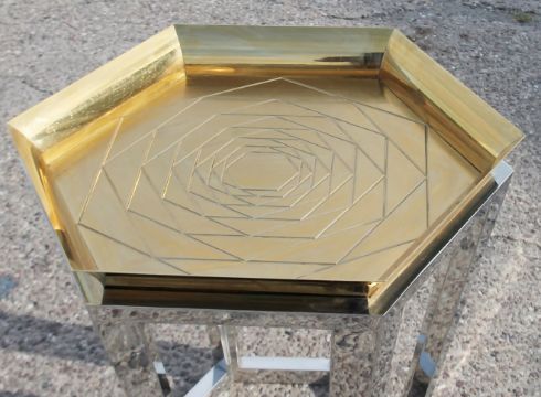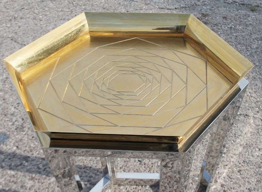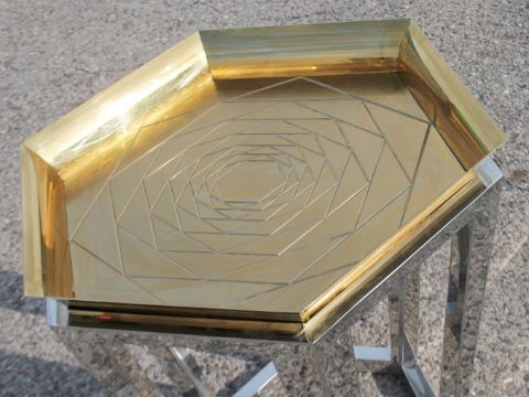 1 x Hexagonal Brass Tray Topped Table Featuring A Geometric Rose Pattern And Chrome Base - Recently Removed From A World-renowned London Department Store - Art: 6519929 - Ref: GEN278/G-IT - CL987 - Location: Altrincham WA14