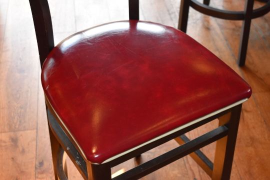 6 x Wine Red Faux Leather Bar Stools From An American Restaurant - Retro Design With Dark Wood Frames, Red Faux Leather Upholstery and White Detailing - CL819 - Location: Altrincham WA14