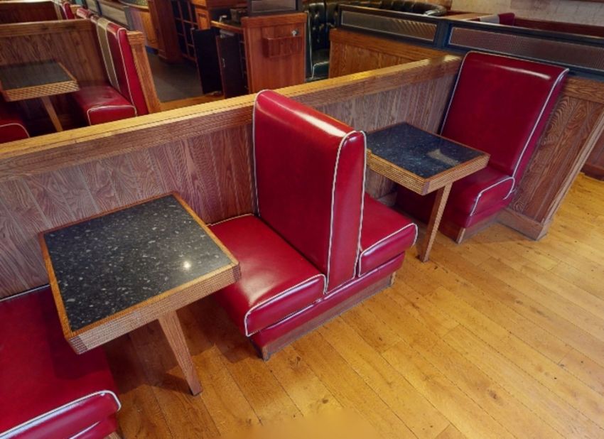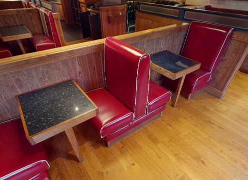 Selection of Single Seating Benches and Dining Tables to Seat Upto 10 Persons - Retro - 1950's American Diner Style With Red Faux Leather Upholstery - Includes 6 x Sections of Seating and 5 x Tables - CL819 - Location: Altrincham WA14