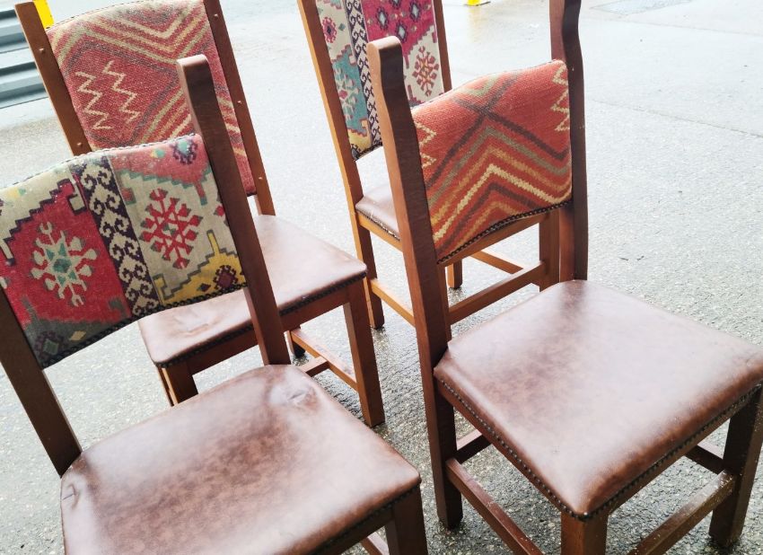 Set Of 5 x Aztec Print Dining Chairs With Faux Brown Leather Seating & Studded Seams From A Popular Mexican Restaurant - CL796 - Location: Altrincham WA14