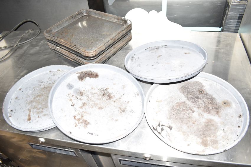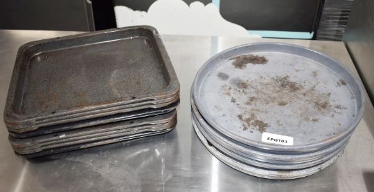 Assorted Collection of 12 x Cooking Trays - Includes 12" Pizza Trays and Deep Oven Trays 32 x 28 cms - Recently Removed From a Restaurant Environment - CL750 - Ref: FPQ103 - Location: Altrincham WA14