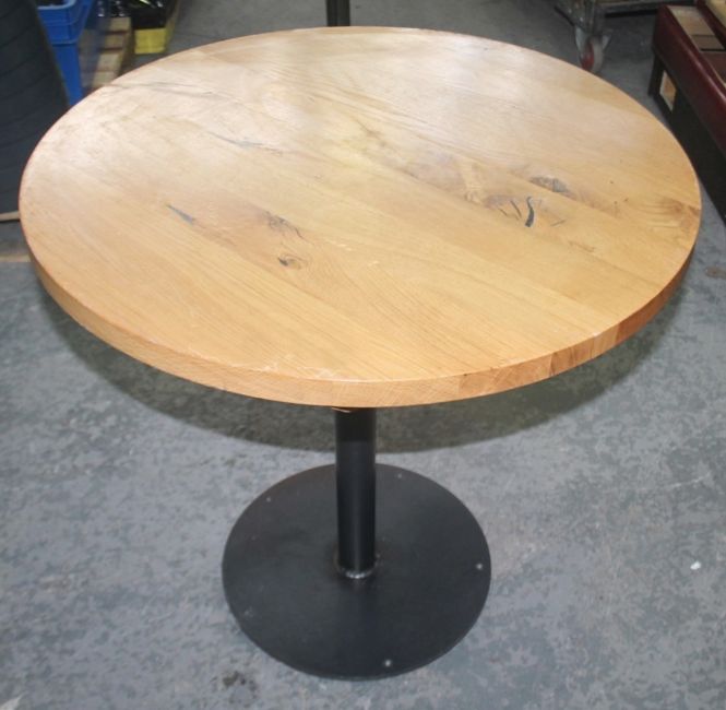 4 x Solid Oak Round Restaurant Dining Tables - Natural Rustic Knotty Oak Tops With Black Cast Iron Bases - Dimensions (approx): H75 x ⌀88cm - Recently Removed From a Popular Restaurant Environment - Ref: BL/TNS - CL818 - Location: Altrincham WA14